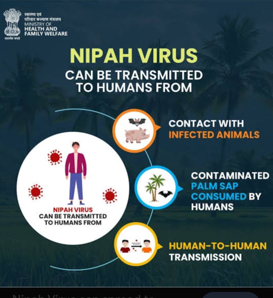 Nipah virus may spread to human beings through close contact with other Nipah-infected persons, infected bats, or infected pigs. Bat secretions laden with the virus can infect people while climbing fruit trees, eating/handling contaminated fallen fruits, or consuming raw date palm sap/juice or toddy. Human-to-human infection can occur from close contact with persons affected with Nipah at home while providing care or close contact and in hospital settings if appropriate personal protective equipment is n